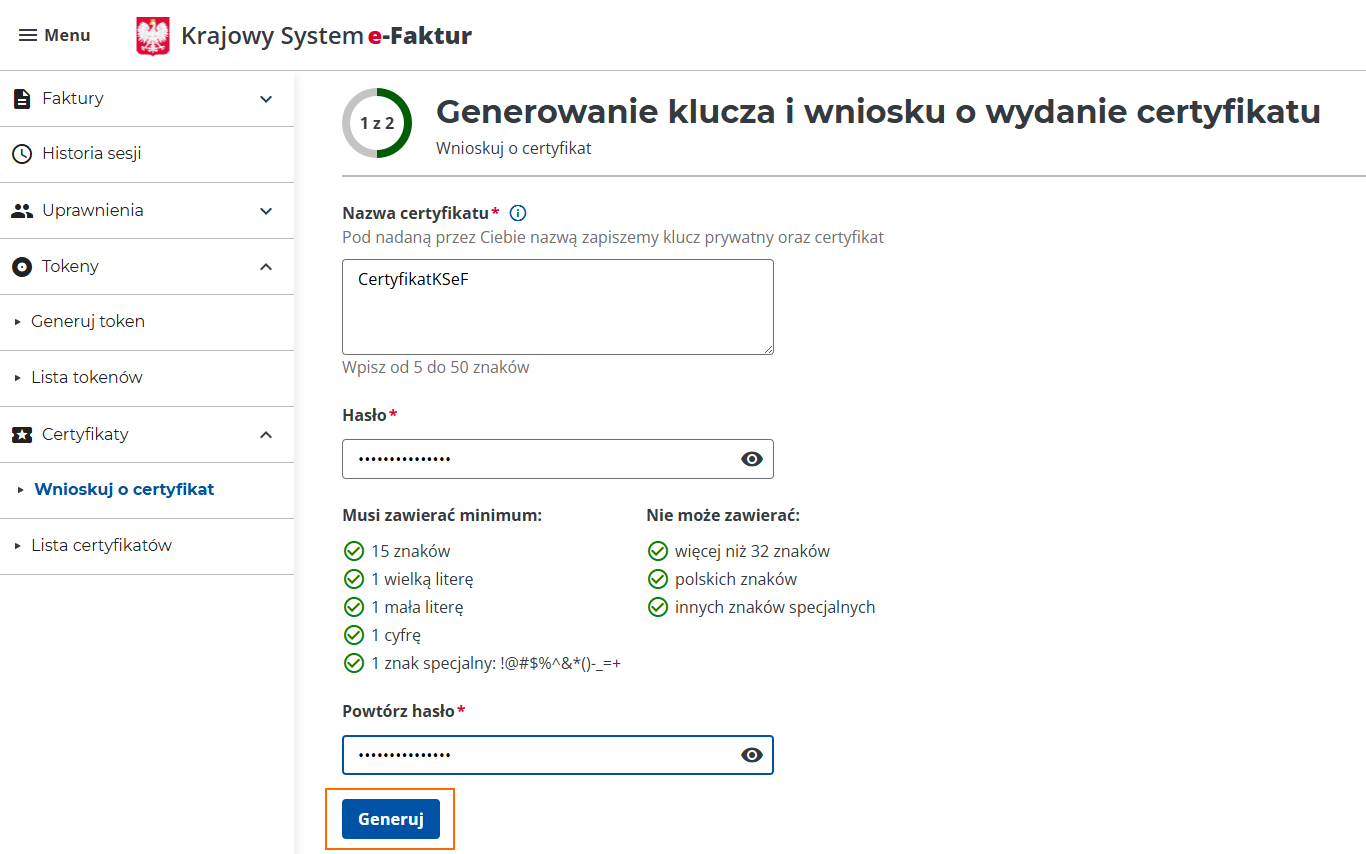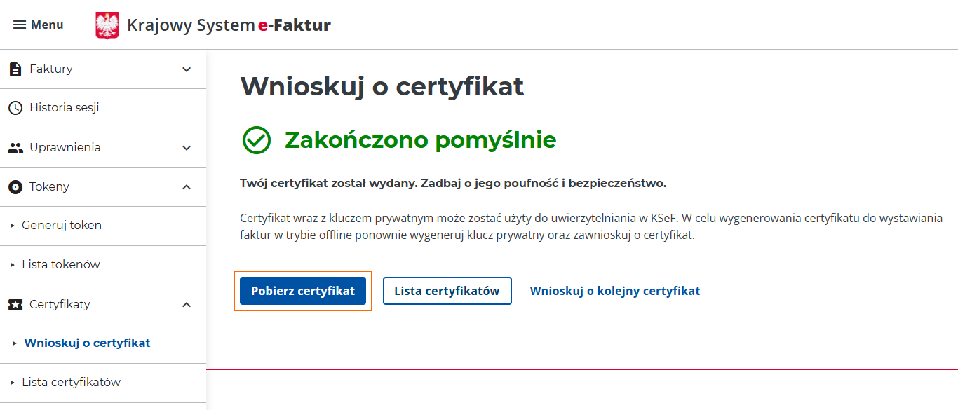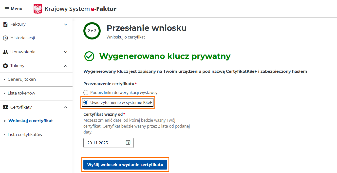 1.1. Należy zalogować się na stronie Krajowego Systemu e-Faktur i wygenerować pliki z rozszerzeniem *.key i *.crt (klucz i certyfikat). Nazwy plików nie powinny zawierać spacji, ten opis zakłada zapisani ich na dysku C w katalogu KSEF ( C:\KSEF\ ).