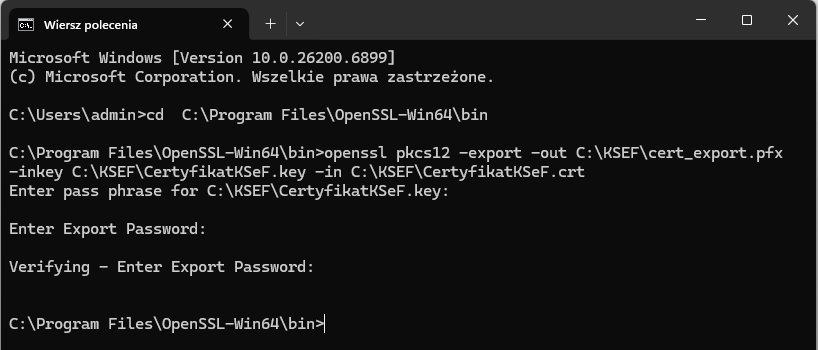wpisać: openssl pkcs12 -export -out C:\KSEF\cert_export.pfx -inkey C:\KSEF\TWOJA_NAZWA_PLIKU.key -in C:\KSEF\TWOJA_NAZWA_PLIKU.crt