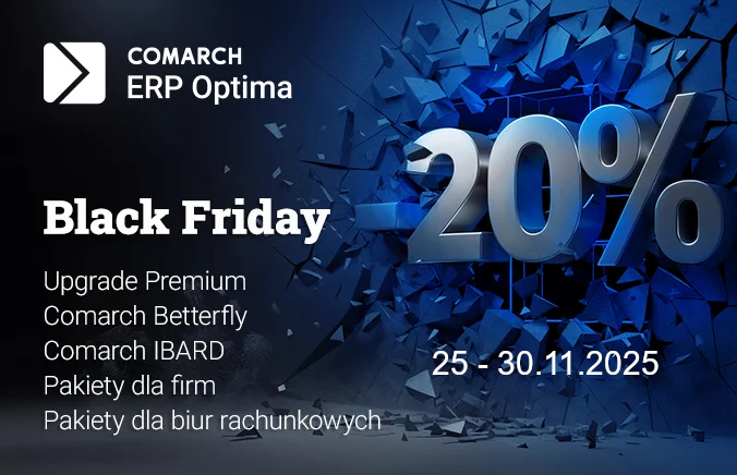w dniach 25.11.2025 - 30.11.2025 będzie specjalna promocja Black Friday dla nowych Klientów. - 20% rabatu na licencje Comarch Betterfly, iBard oraz pakiety startowe Optima dla Firm i Biur Rachunkowych.